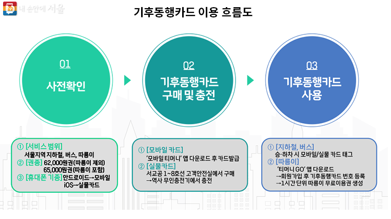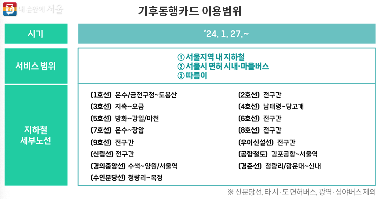 서울시에서 대중교통 무제한 이용이 가능한 '기후동행카드'를 출시합니다. 시행일은 24년 1월 27일 부터 입니다.
