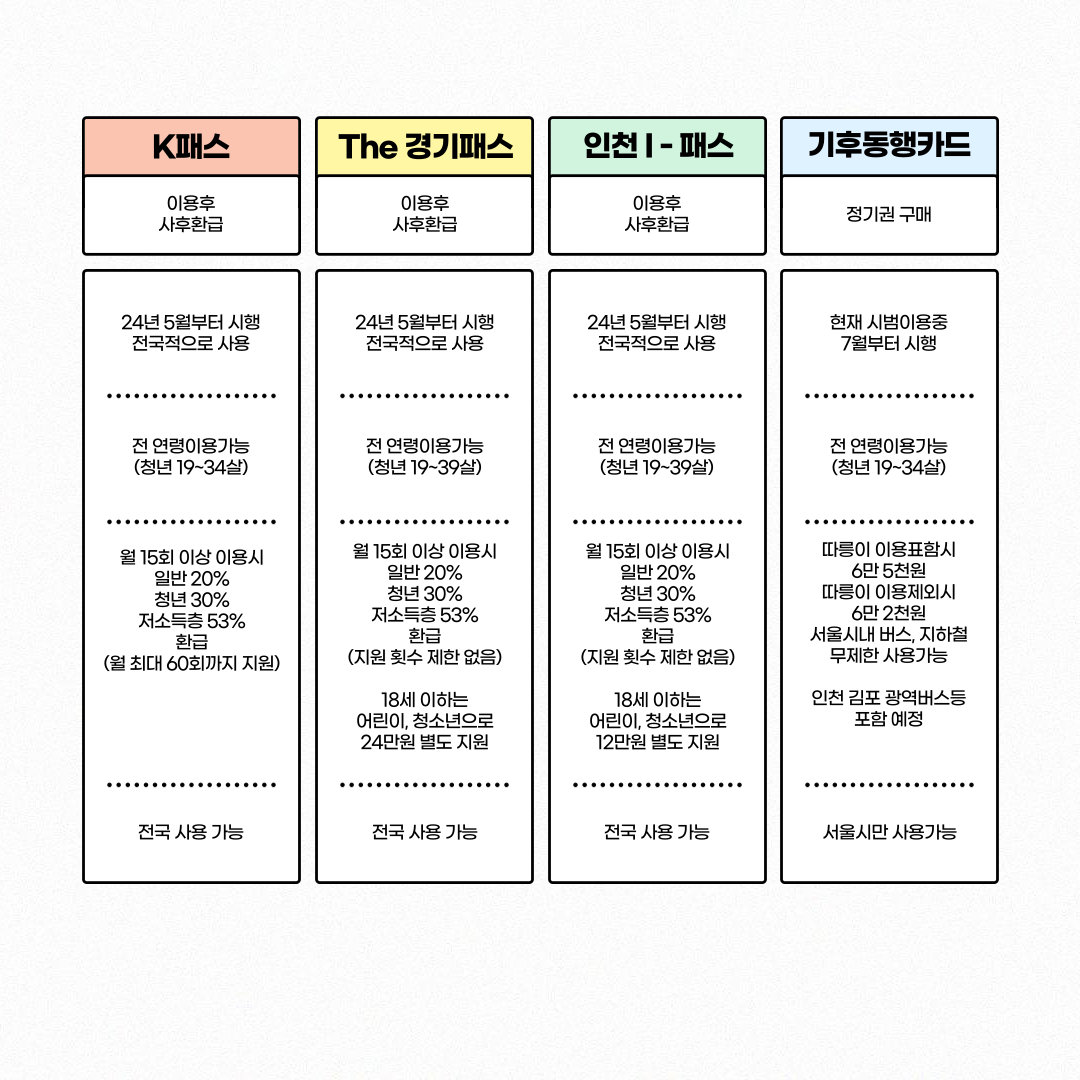 교통비를 절약할 수 있는 교통카드들이 대거 등장했다. 알뜰교통카드와 기후동행카드(서울시)는 이미 사용중이고 알뜰교통카드를 업그레이드한 K 패스카드가 24년 5월 1일 부터 사용된다. 그밖에 The 경기패스, 인천 I - 패스 도 7월부터 사용이 가능하다.